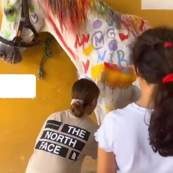 En algunas imágenes, el equino, que usan como lienzo, aparece parado junto a una pared, mientras los niños a su alrededor lo pintan de varios colores y hacen dibujos.