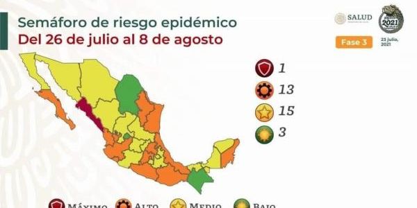 Esta tarde se dio a conocer por parte de las autoridades federales, que el estado de Nayarit pasaba a semáforo epidemiológico Naranja; junto al estado se encuentran 13 entidades más en color naranja, 15 estados más permanecen en Amarillo, 3 estados en color verde y únicamente el estado vecino Sinaloa se encuentra en rojo derivado a los contagios que han ido en aumento.