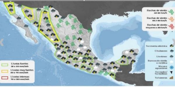 Sin embargo, hay posibilidad de tormentas eléctricas para Baja California, Sonora, Chihuahua, Coahuila, Nuevo León, Tamaulipas, San Luis Potosí, Zacatecas, Durango, Sinaloa, Nayarit, Jalisco, Colima, Michoacán, Estado de México, Ciudad de México, Morelos, Tlaxcala, Puebla, Veracruz, Guerrero, Oaxaca, Chiapas, Campeche, Yucatán y Quintana Roo.