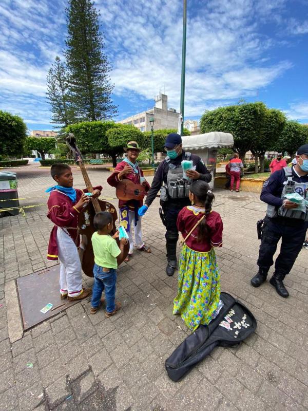 Elementos de la Policía Estatal, continúan regalando cubrebocas a las personas que se encuentran en la vía pública y en zonas con afluencia, esto con la finalidad de minimizar la ola de contagios de coronavirus.