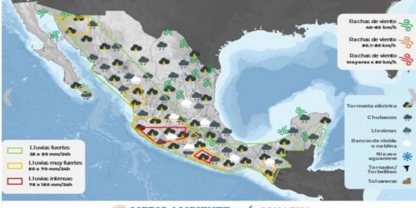 Según la comisión, habrá intervalos de chubascos con lluvias puntuales fuertes (25.1 a 50.0 mm): Baja California Sur, Zacatecas, Nayarit, Colima, Michoacán, Estado de México, Tabasco, Campeche, Yucatán y Quintana Roo.