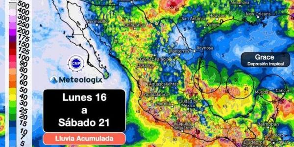 -Lluviaas: Grace a su paso generará lluvias fuertes con tormentas severas y locales muy fuertes sobre península Yucatán, sur, sureste, huasteca centro y noreste del país. S