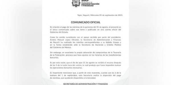 Es por esta razón, que el día de ayer 31 de agosto se recibió el recurso después de las 5 de la tarde hora del centro, lo cuál produjo que fuera imposible realizar las operaciones bancarias necesarias", refiere el documento.