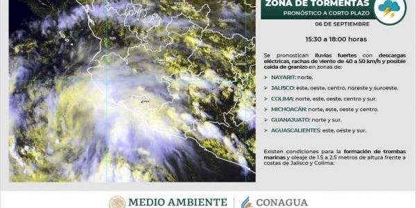 Durante esta tarde se esperan lluvias fuertes con descargas eléctricas, en regiones de Nayarit, Jalisco, Colima, Michoacán, Guanajuato y Aguascalientes.
