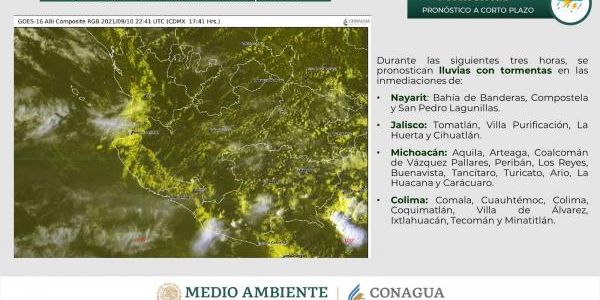 Lluvias con tormentas se pronostican para esta tarde y noche en municipios de Nayarit, Jalisco, Michoacán y Colima.