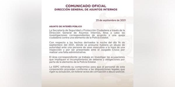 A través de un comunicado, explicó que los hechos ocurrieron el 14 de septiembre de 2021, donde presuntamente habría un abuso de autoridad hacia un hombre al momento de una inspección y por ser presentado ante el Juzgado Cívico por una falta administrativa.