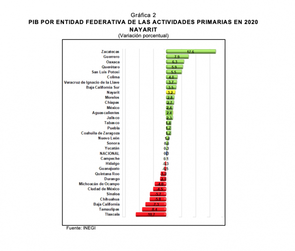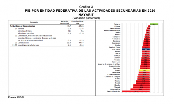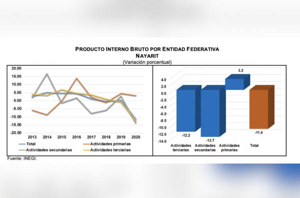 Nayarit observó un decremento anual en términos reales de (-)11.4 por ciento, en el total de su economía durante 2020, según los resultados anuales del Producto Interno Bruto por Entidad Federativa (PIBE) en su versión preliminar del INEGI.