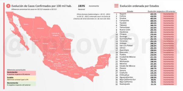 Según el mapa proporcionado por dicha plataforma, Nayarit presenta el 433.3 por ciento de evolución respecto a la última semana epidemiológica del 26 de diciembre de 2021 al 1 de enero de 2022.