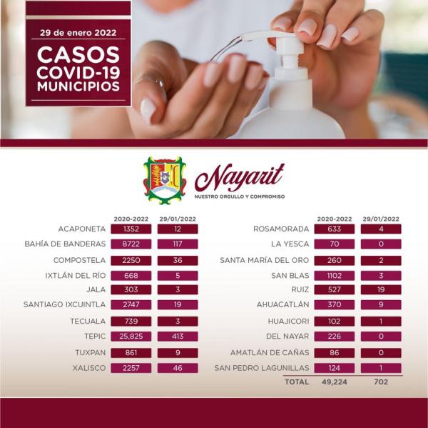Este sábado 29 de enero se registraron 702 nuevos casos de Covid-19 en Nayarit.