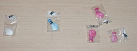 3 envoltorios de color rosa que contienen una sustancia cristalina con las características del cristal.