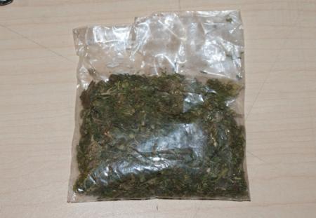 Una bolsa de plástico que contiene un vegetal verde y seco, con las características propias a las de la marihuana.