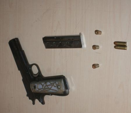 Una pistola Marca Colt, calibre 0.38 súper, cachas blancas de plástico y cargador cromado abastecido con 5 cartuchos útiles al calibre.