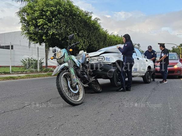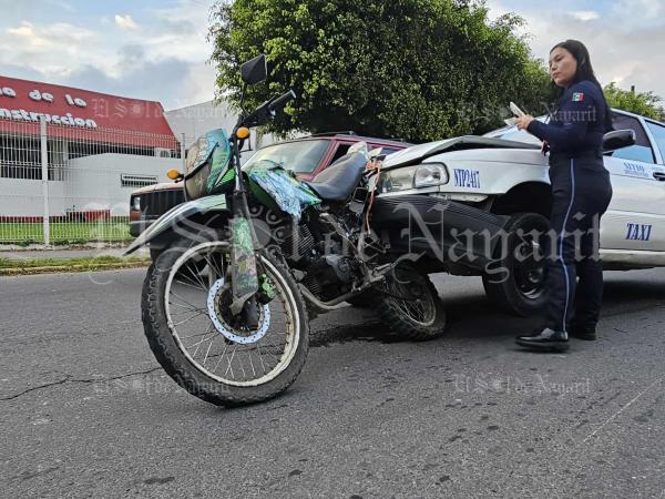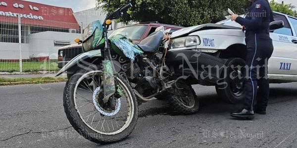 Según se refiere, el conductor de un taxi color blanco se impactó de lleno contra el conductor de una motocicleta, quedando la unidad de dos llantas incrustada en el cofre de la unidad del transporte público.