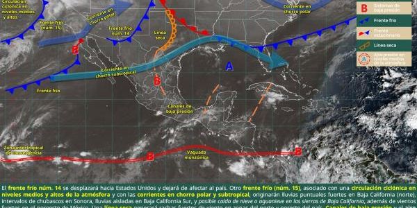 Hoy, se prevé que el frente frío núm. 14 se desplace hacia Estados Unidos y deje de afectar al país. Sin embargo, otro frente frío (núm. 15) se aproximará al noroeste de México, asociado con una circulación ciclónica en niveles medios y altos de la atmósfera, y con corrientes en chorro polar y subtropical.