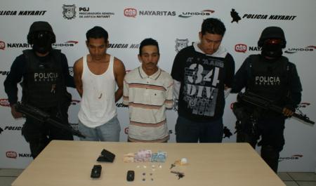 Durante un recorrido de vigilancia implementado al interior de la Colonia Benito Juárez, de ésta Ciudad, elementos de la Policía Nayarit llevaron a cabo la detención de 3 sujetos, quienes minutos antes de ser aprehendidos realizaban un tipo de intercambio, mismo que al ser corroborado por los efectivos se comprobó era la compra-venta de estupefacientes.