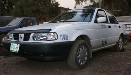 Un taxi color blanco, numero económico TX-07-66, marca Nissan, Tipo Tsuru, modelo 2007, con placas de circulación del estado de Nayarit.
