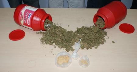 2 botes cilíndricos de plástico en color rojo, ambos en su interior un vegetal verde y seco con las características propias de la marihuana.