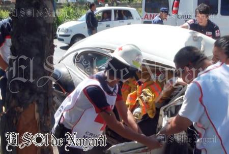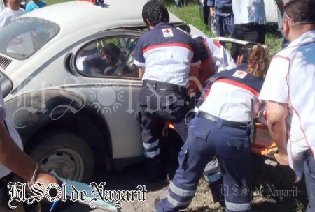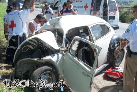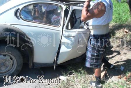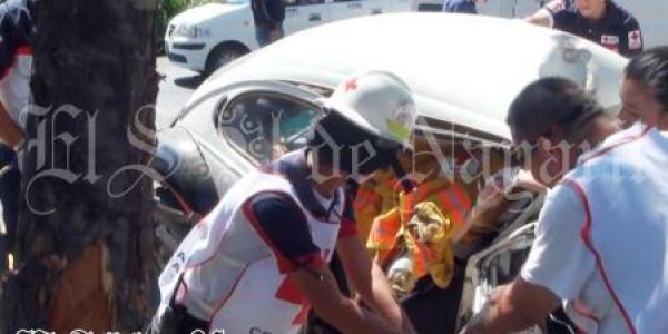 A exceso de velocidad viajaban a bordo de un vochito, solo que el conductor lo hacía a exceso de velocidad, terminando por chocar contra un árbol, dejando a los dos ocupantes severamente lesionados.