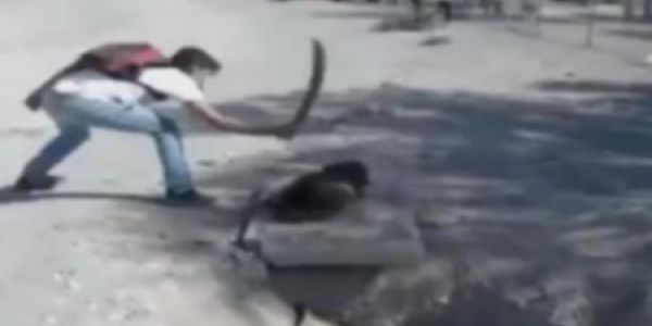 Tras apedrearlo, uno de los jóvenes asesta un machetazo a la altura del cuello del animal y tras repetir la sanguinaria acción, le da muerte.