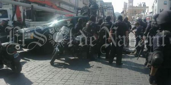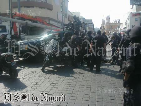 Los hechos se registraron poco antes de las 11:00 de la mañana en Av. Allende y México, cuando los elementos de la Policía Nayarit circulaban a bordo de sus motocicletas al momento en que fueron impactados por un taxi color blanco, de Compostela, conducido por Efraín Plasencia González, dejando a los dos agentes tendidos y lesionados en la calle.