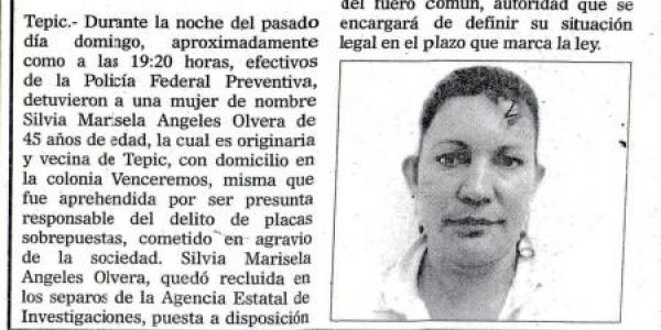 La denunciante, de nombre Silvia Maricela Angeles Olvera, comenta en una Carta dirigida a esta redacción que el pasado domingo 9 de septiembre de 2012, venía de participar en la clausura de un encuentro-retiro del Movimiento Misionero Católico, que se había efectuado en el poblado de Tetitlán, municipio de Ahuacatlán. Serían las 7 u 8 de la noche y al circular en el vehículo de mi propiedad que es una camioneta Town Country, color cereza, por la carretera federal 15 a la altura del crucero de Santa María del Oro, nos llamó la atención, porque veníamos varias personas, que una patrulla de la Policía Federal, comenzó a seguirme en forma por demás sospechosa, procediendo a marcarme el alto total, dizque para una verificación de documentos, a lo que accedí comedidamente.