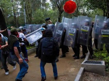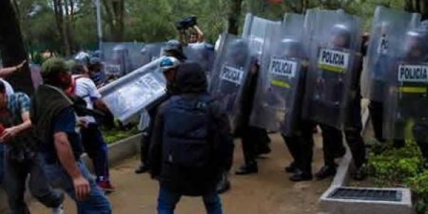 Algunos de los manifestantes quitaron sus escudos a los agentes, mientras que en el altercado aparentemente se usó gas lacrimógeno. Inconformes usaron tubos del mobiliario urbano para atacar a los agentes, reportó Notimex.