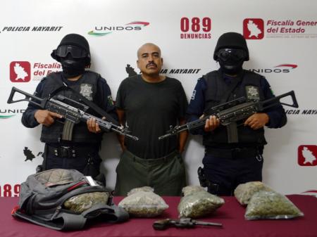 Durante su captura, el Cuerpo Élite de Seguridad le aseguró además del arma de fuego una mochila que portaba al hombro, misma que contenía siete envoltorios de plástico con un vegetal verde y seco parecido a la marihuana.
