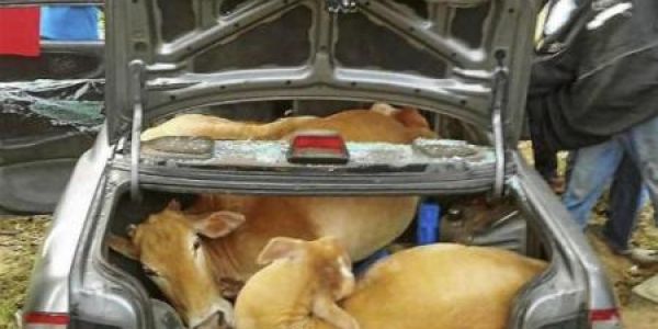 Unos ladrones en Bukit Mertajam, Malasia; robaron 4 vacas e intentaron llevárselas en un vehículo muy pequeño, sin embargo debido al peso de los animales el coche no pudo avanzar haciendo imposible su fuga.