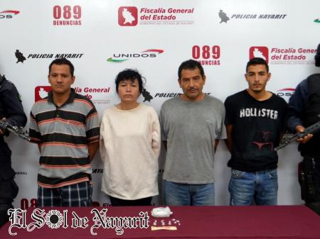 El dispositivo de seguridad desplegado en la localidad de Las Varas, permitió la captura de Irma Rodríguez Ramírez, Jorge Luis Delgadillo Rosales, Eduardo Flores Cárdenas y Luciano Velázquez Rodríguez, de 39, 53, 39 y 19 años de edad.