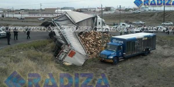 La mañana de este lunes, un tráiler que transportaba aproximadamente 50 toneladas de cerveza, sufrió una volcadura en la carretera federal 45 en Ciudad Delicias, Chihuahua.