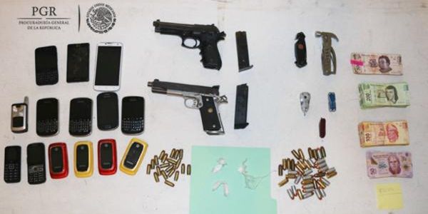 Al efectuar la inspección al automóvil, se localizó una pistola tipo escuadra, marca caspian, calibre .45mm y un arma tipo escuadra, marca Taurus, calibre 40mm, así como un cargador de arma de fuego para pistola calibre 45mm, un cargador de arma de fuego para pistola calibre 40mm, 38 cartuchos calibre 45mm, 20 cartuchos calibre 40mm, dos dosis de metanfetamina, la cantidad de 50 mil 550 pesos, cinco navajas de diferentes tamaños, seis radios, siete teléfonos celulares y varias alhajas.