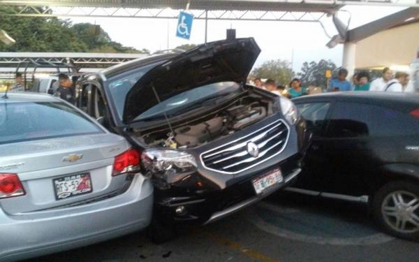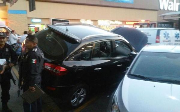 Los hechos sucedieron cuando un vehículo tipo Renault con placas de Aguascalientes, que iba entrando al estacionamiento de dicha tienda, sufrió una falla pues se le pegó el acelerador, provocando que el conductor terminara sobre el pasillo donde pasa la gente y quedara entre dos vehículos, pues el automóvil no daba reversa.