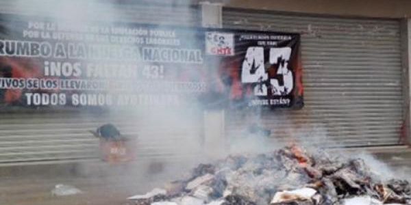 Los maestros disidentes entraron al edificio del Consejo Distrital del INE en Juchitán y sustrajeron papelería, mamparas y artículos de oficina, después los arrojaron a la calle y los prendieron fuego. Las llamas se propagaron a la oficina electoral.