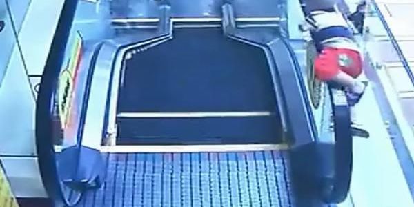 Las cámaras del lugar grabaron el impactante suceso, cuando el infante se acerca al barandal de una escalera eléctrica y es jalado por el sistema en movimiento, por lo que cae al primer piso.