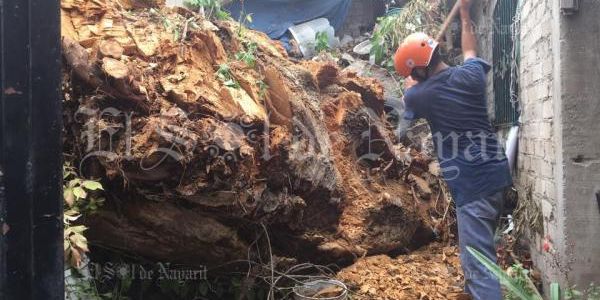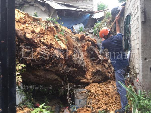 La tarde de este martes dos viviendas ubicadas sobre la calle Camino Viejo a Jauja, en Tepic, se vieron afectadas por la caída de un colosal árbol.