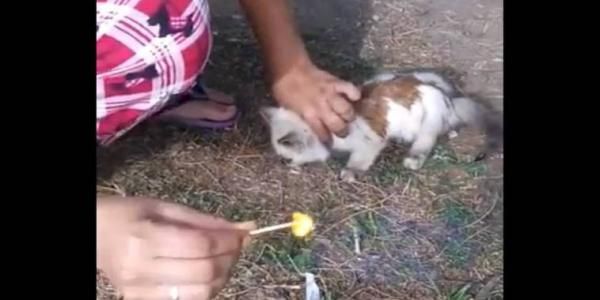 En la grabación se aprecia como la mujer toma a un pequeño gato blanco, le vierte un líquido sin identificar y posteriormente trata de prenderle un cerillo.