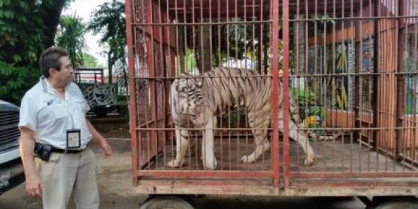 Los tigres de bengala, cuatro hembras y dos machos, también fueron encontrados en un lamentable estado, una de ellas con mutilaciones en las extremidades inferiores, además de un severo estado de debilidad e inanición. La dependencia informó que los felinos no tenían garras y colmillos y se encontraban dentro de una jaula muy pequeña.