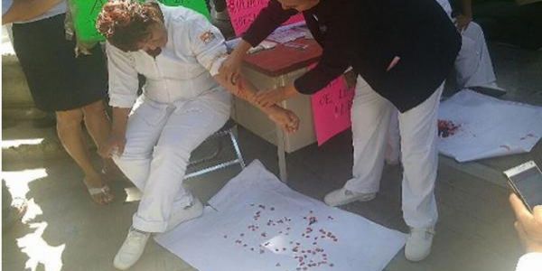 De acuerdo con el secretario general del Sindicato Independiente Nacional de Trabajadores de Salud, Genaro Villalobos Sánchez, los manifestantes decidieron desangrarse por la desesperación de la situación que enfrentan.