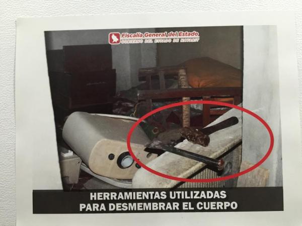 Para el brutal acto habría utilizado un machete, un cuchillo, un marro y un cincel, mismos que fueron localizados en la vivienda, además, en la entrada del domicilio se localizaron manchas de sangre.