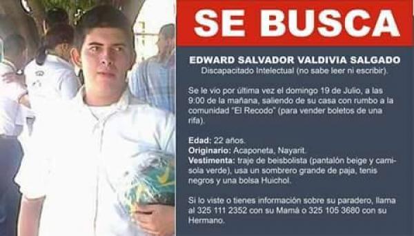 Este lunes se dio a conocer en redes sociales y medios de comunicación de Nayarit la desaparición del joven Edward Salvador Valdivia Salgado, de 22 años de edad y vecino del municipio de Acaponeta.