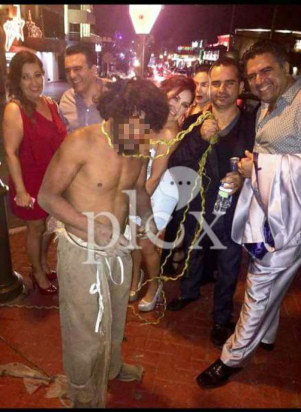 Una fotografía enviada por un denunciante anónimo al portal Plex evidencia el momento en que un grupo de personas posan sonrientes en la zona turística de Ensenada, Baja California, mientras uno de ellos sujeta del cuello con una cuerda a una persona en situación de calle.