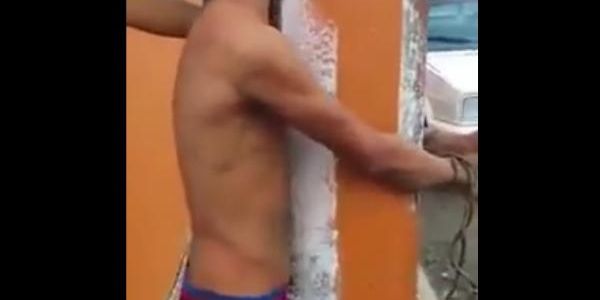 Las personas lo atan a un poste de luz y lo desnudan; después comienzan a golpearlo con un machete.