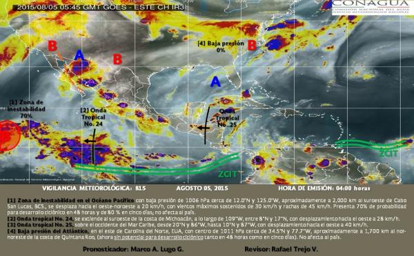 Un canal de baja presión que se extiende desde el norte hasta el centro del territorio nacional es el responsable por las condiciones mencionadas, y se asociará con la entrada de humedad del Océano Pacífico y del Golfo de México.