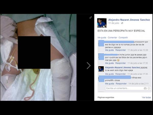 Una de esas polémicas imágenes es la de Alejandro Nazaret Jiménez, egresado de medicina, quien realiza su internado en el hospital regional Arriaga de Chiapas; de acuerdo con el diario Zócalo Saltillo, el joven posteó en el mes de julio, en su página de Facebook, a un menor que muestra sus genitales, acompañado de un comentario: Esta es una personita muy especial.