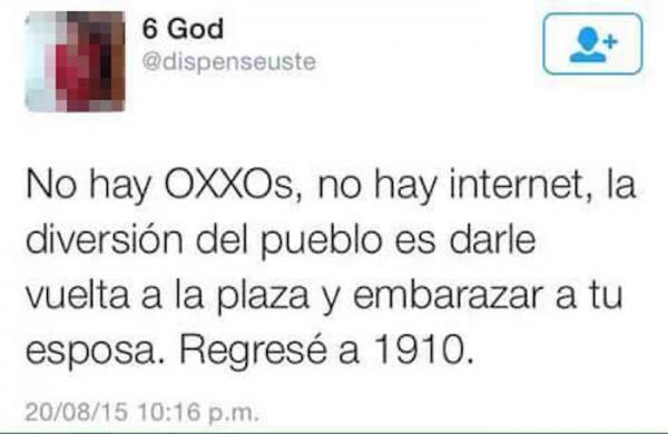 No hay OXXOs, no hay internet, la diversión del pueblo es darle vuelta a la plaza y embarazar a tu esposa. Regresé a 1910″, publicó en esa fecha.