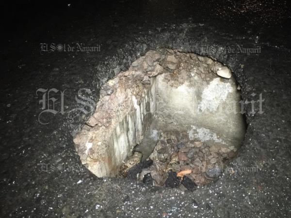 Es no es un bache, es un crater,medio metro de profundidad y 25 centímetros de diámetro y sin señalamiento, le salio vara al compa