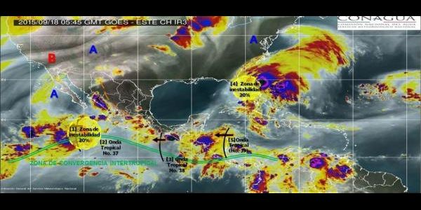 Por otro lado, en el Océano Pacífico, una zona de inestabilidad con 30% de probabilidad de desarrollo ciclónico en el pronóstico a 48 horas, se ubica aproximadamente a 600 kilómetros (km) al sur-suroeste de Cabo San Lucas, Baja California Sur, con vientos máximos sostenidos de 20 kilómetros por hora (km/h), rachas de hasta 35 km/h y movimiento lento hacia noroeste. Este sistema de baja presión absorbió a la Onda Tropical Número 37, lo que favorecerá desprendimientos nubosos con lluvias fuertes en Baja California Sur.