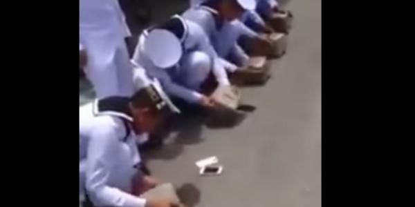 En el video los marineros se encuentran alineados en fila, con sus respectivos teléfonos tendidos en el piso.