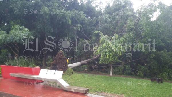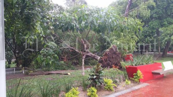 Asimismo, un árbol de La Loma cayó sobre las vías del trenecito, afortunadamente no originó mayores daños, al igual que otro árbol que cayó en el canal, a espaldas de Plaza de Álica y otros más en el libramiento del que aún se recaba información.