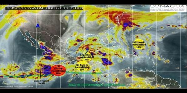 Para hoy, la zona de inestabilidad con potencial para desarrollo ciclónico se localizará muy cerca de la línea de costa de Oaxaca y Chiapas, en interacción con un canal de baja presión sobre el occidente del Golfo de México, favorecerá potencial de lluvias intensas en Veracruz, (centro y sur), Oaxaca y Chiapas (principalmente en zonas de sierra y costas); muy fuertes en Puebla y Tabasco; fuertes en Nuevo León, Tamaulipas, San Luis Potosí e Hidalgo; además de viento de 30 a 45 km/h con rachas de hasta 60 km/h en el Golfo de Tehuantepec y oleaje de 1 a 2 metros de altura en la costa desde Chiapas hasta Guerrero.